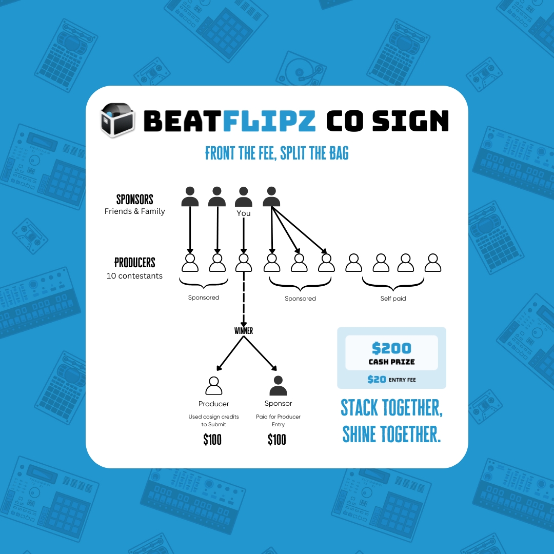 Here’s the deal: When someone Co-Signs you, they fund your contest entry. If you win, you both share in the prize, making it a win-win for everyone involved. With new contests and genres every day, BeatFlipz Co-Sign is the perfect way for others to support your craft while you focus on making beats and getting paid.
