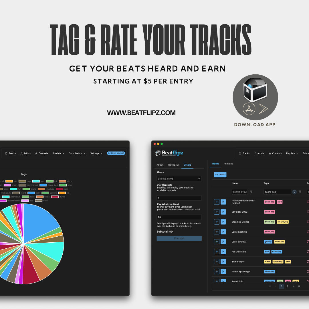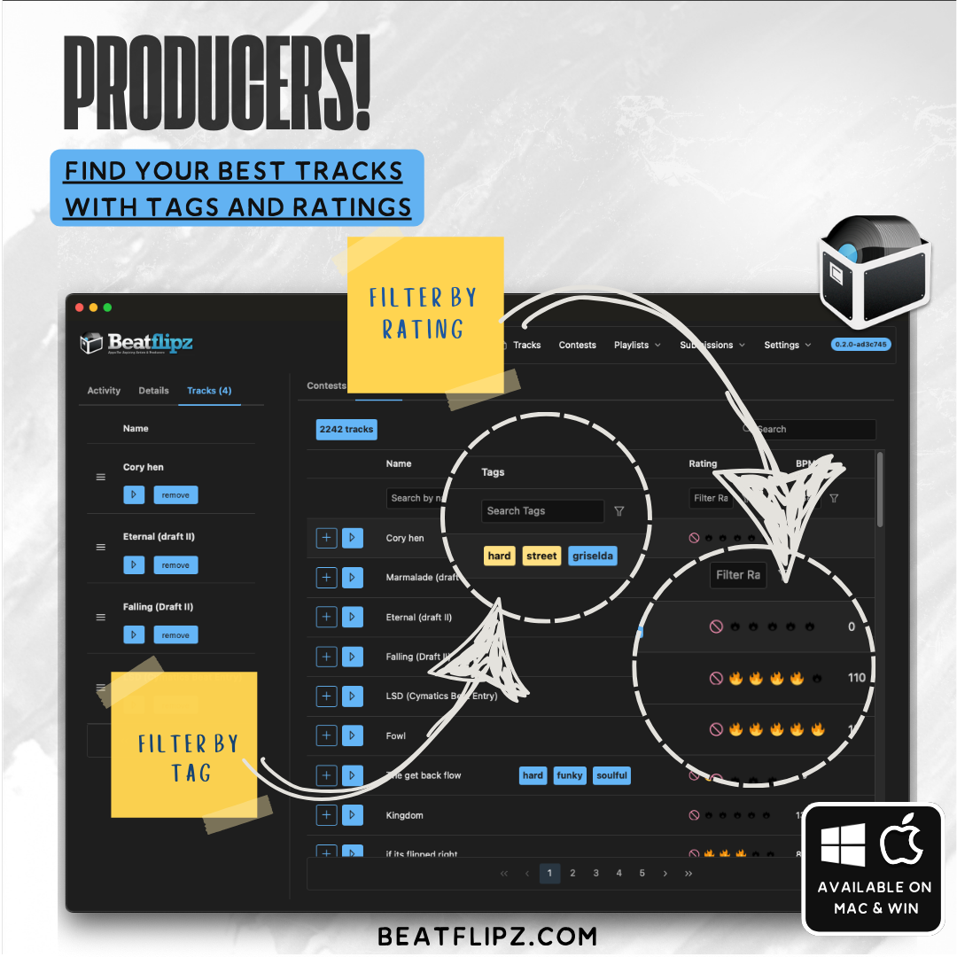 - Full Access to BeatFlipz Desktop App: Beat tagging, rating, beat tape design, and Co-Sign Promo.