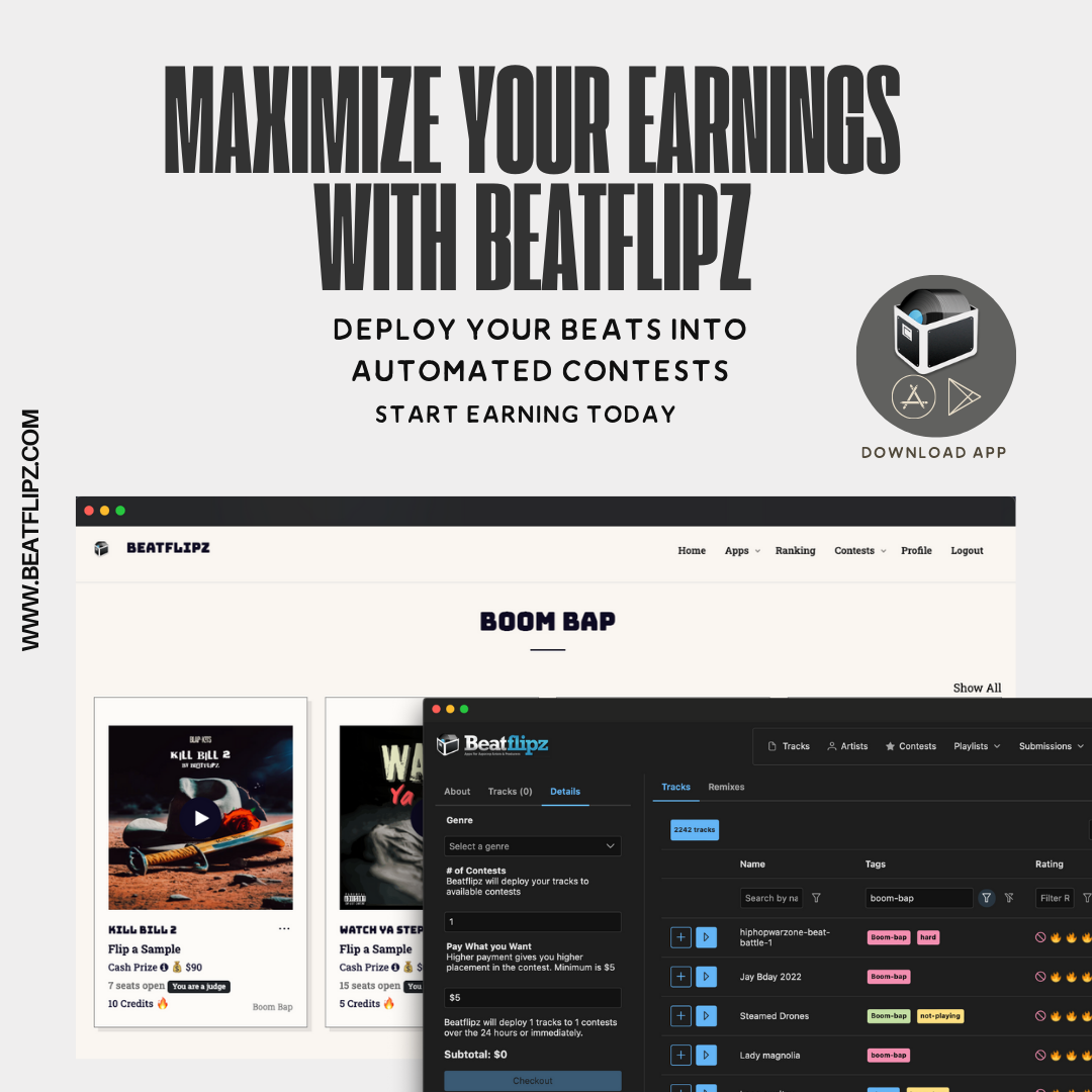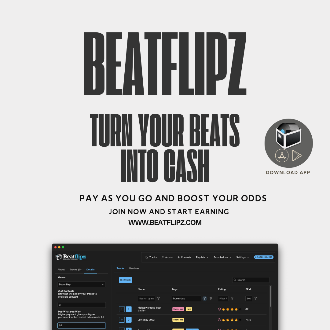 BeatFlipz gives you everything you need to turn your beats into income. Enter exclusive cash-prize contests, create professional music videos, and build your brand—all from one platform.
